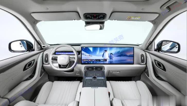 内饰确实有理想L系列的影子,30英寸连体屏、竖向空调出风口,但也有自己的原创设计。到处都是皮质包覆,镀铬饰条配木纹饰板,豪华感营造得不错。256色氛围灯晚上开车氛围感拉满。